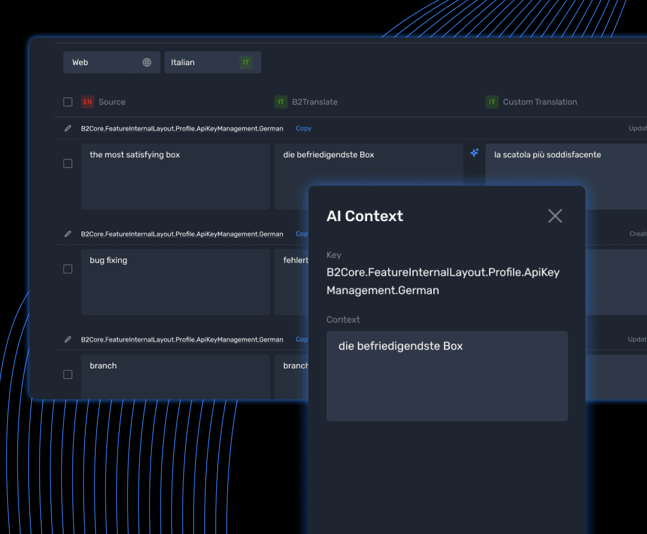 73% of users are more likely to buy or sign up when a product is available in their native language. B2TRANSLATE enables you to deliver exactly that — a fully localized experience across dashboards, websites, applications, and any other content you need to translate, without unnecessary complexity. Translate, proofread, and publish in real time — fast, seamless, and efficient.